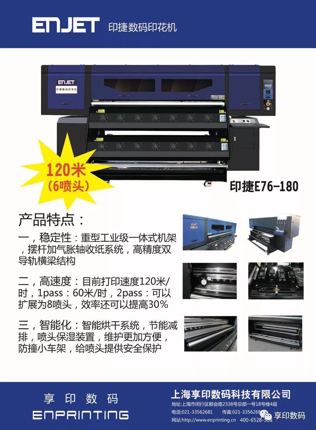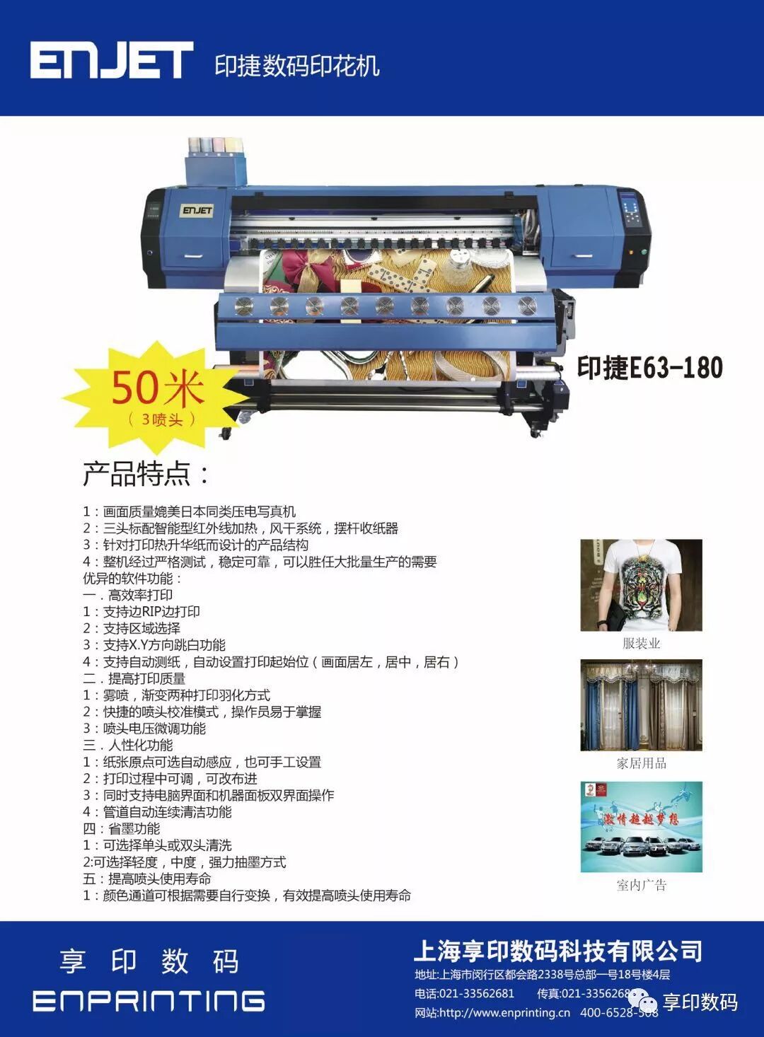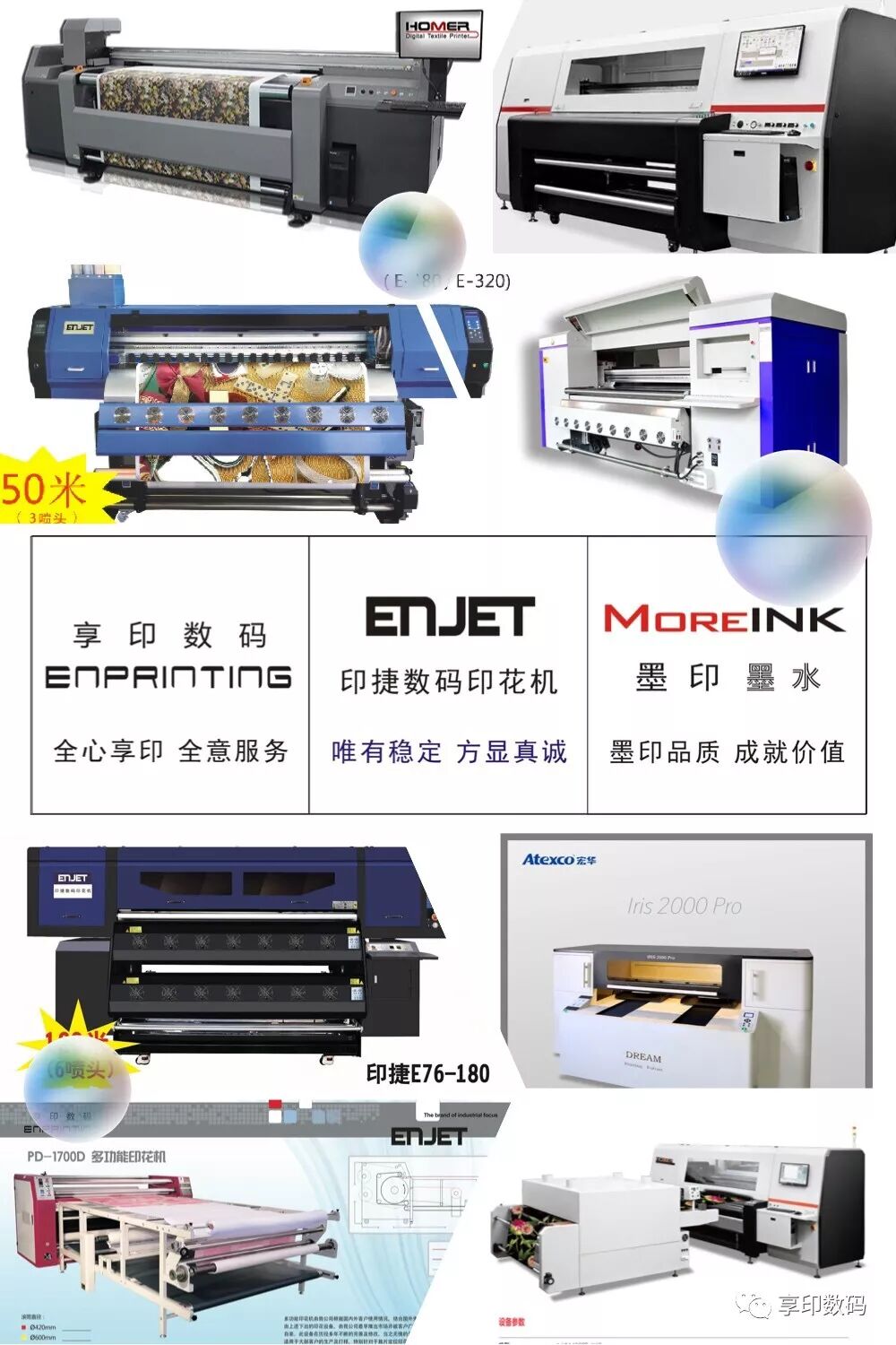享印数码:数码印花值得信赖的战略合作伙伴!本着“创新,分享”的企业经营理念,提供“质量稳定,品质保证”数码印花设备。公司代理弘美,宏华,ENJET印捷数码印花机,MOREINK墨印高品质喷墨墨水,下设柯桥、盛泽、临平、南通办事处,专注为服装,面料,印花,花型设计,家纺,布艺等纺织相关企业,提供涤纶,棉麻,丝绸,尼龙等面料的数码印花应用方案。